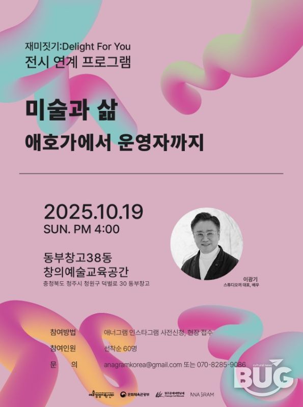 이번 강연은 2025 청주공예비엔날레에서 만나는 신진작가 전시 ‘재미 짓기 : Delight for you(이하, 재미 짓기)’와 연계한 프로그램으로, 미술 애호가에서 아트 스튜디오의 운영자로 예술을 통해 삶의 재미를 풍성하게 지어온 배우 이광기 씨의 세상을 엿보는 기회다.