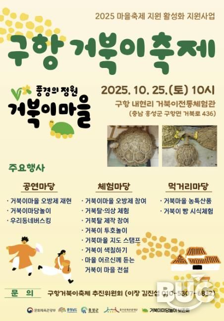 부울경문화뉴스 관리자 기자 | (재)홍주문화관광재단 문화도시센터는 ‘마을 축제 지원 및 활성화 사업’의 일환으로 오는 25일 오전 10시부터 오후 4시까지, 충남 홍성군 구항면 거북로 436 일원에서 ‘구항 거북이 축제’를 개최한다.