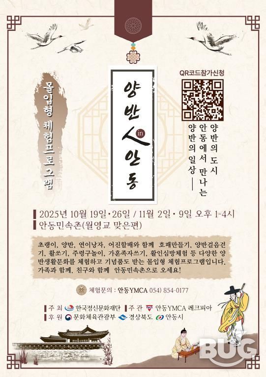 안동민속촌 일원에서 진행되며, 참여자들이 ‘안동인(人)’으로 살아보는 몰입형 체험 콘텐츠로 구성돼 있다. 매주 일요일 오후 1시부터 4시까지 4주간 운영되며, 사전 신청 또는 현장 접수를 통해 누구나 참여할 수 있다.