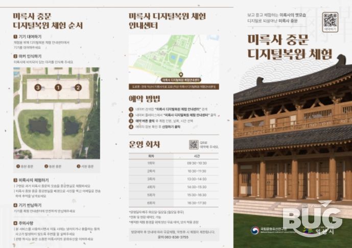 미륵사 중문 디지털 복원 체험은 매주 화요일부터 일요일(월요일 휴무)까지 1일 6회 무료로 운영되며, 회차당 30명씩 참여할 수 있다. 현장 접수(회차당 5명) 또는 네이버에 ‘미륵사 디지털 복원 체험 안내센터’ 검색 후 예약 누리집(회차당 25명)에서 온라인 예약 가능하다.