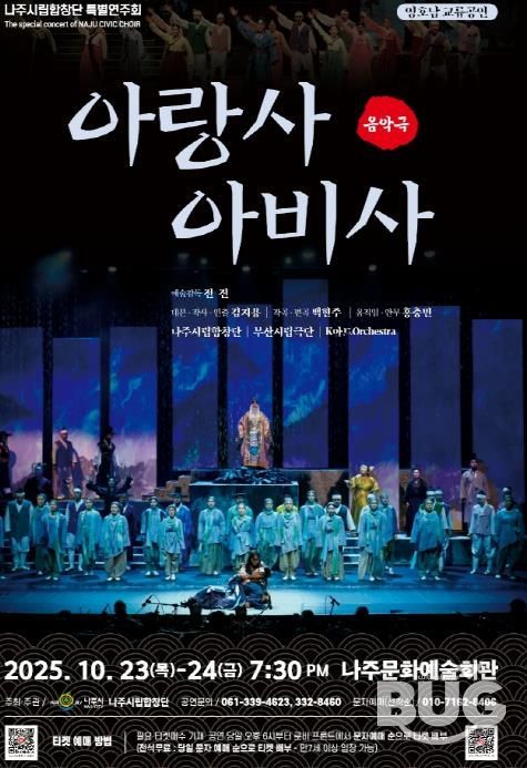 이번 공연은 나주 지역 설화인 ‘앙암바위 전설, 아랑사 아비사’를 바탕으로 한 창작음악극으로 나주의 역사와 정체성을 예술로 풀어낸 대표적인 지역 문화공연이다.