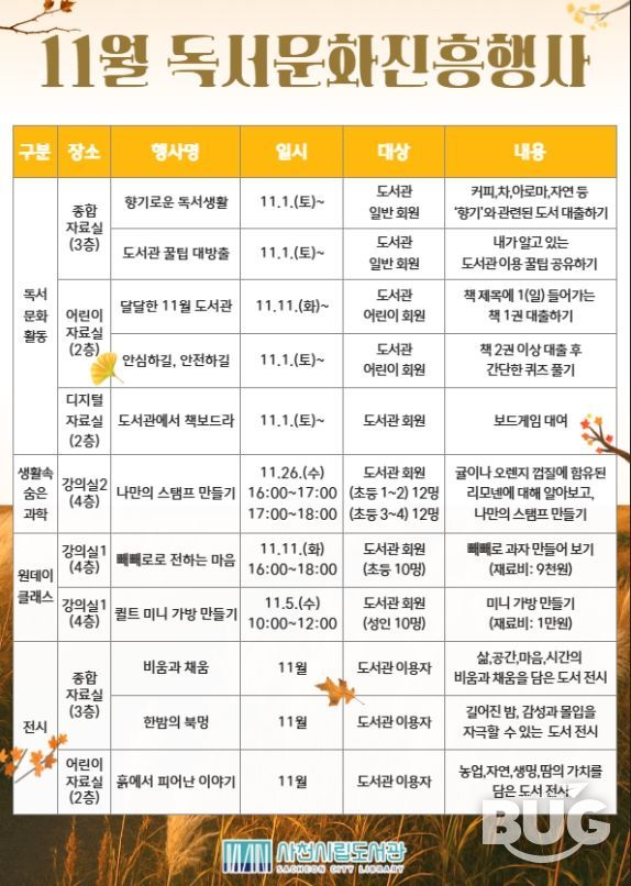 부울경문화뉴스 관리자 기자 | 사천시는 사천시립도서관에서 11월 한 달 동안 책과 함께 여유로운 시간을 보내며 감성을 채울 수 있는 다양한 독서문화행사와 체험 프로그램을 운영한다고 17일 밝혔다.