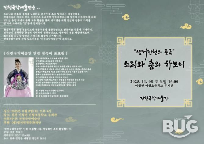 부울경문화뉴스 관리자 기자 | (재)생거진천문화재단은 오는 11월 8일 오후 4시 이월초등학교 ‘무제관’에서 진천국악예술단이 ‘진천의 풍류, 소리와 춤의 하모니’ 공연을 개최한다고 20일 밝혔다.