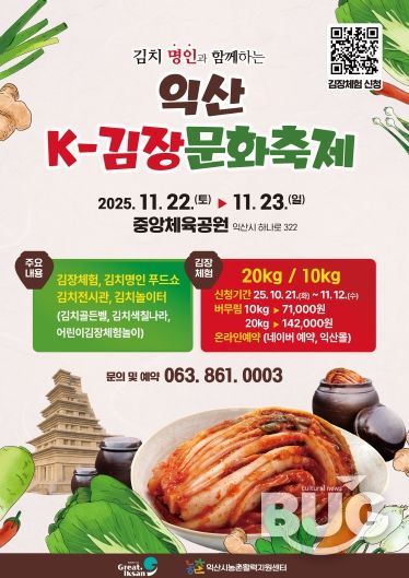 정헌율 익산시장은 "김장문화는 우리 고유의 전통이자 소중한 유산"이라며 "세대를 넘어 모두가 함께 어우러지는 참여형 축제를 통해 익산만의 고유한 맛과 멋을 되새기고, 시민들이 나눔과 전통의 가치를 함께 나누길 바란다"고 말했다.