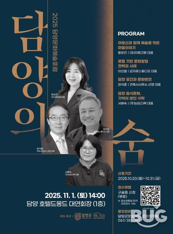 부울경문화뉴스 관리자 기자 | 담양군문화재단은 11월 1일 토요일 오후 2시, 담양 호텔드몽드 대연회장에서 2025 담양 문화예술포럼 '담양의 숨'을 개최한다고 밝혔다.
