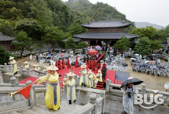 드라마 세트장처럼 꾸며진 황궁 앞 거리에는 관람객과 관계자가 나란히 도열하고 그 사이로 북소리를 울리며 군사와 군마 행렬이 지나가며 거대한 야외 연극장을 연출한다.