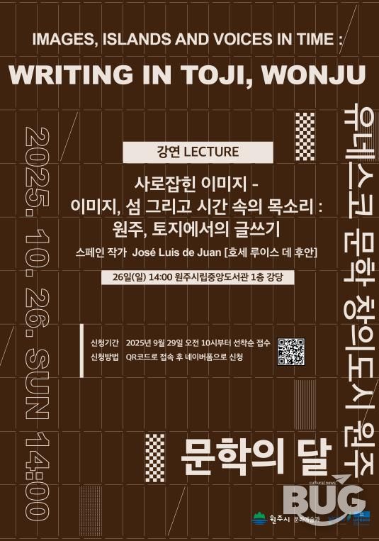이번 강연은 ‘Images, islands and voices in time: writing in Toji, Wonju(이미지, 섬 그리고 시간 속의 목소리: 원주, 토지에서의 글쓰기)’를 주제로, 작가가 원주에서 집필하며 느낀 한국의 문학적 풍경과 예술적 영감을 공유하는 자리다. 문학을 통해 세계와 지역이 소통하는 유네스코 창의도시의 정체성을 보여주는 ‘2025 원주 문학의 달’의 뜻깊은 기념행사로 마련됐다.