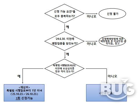 특별법 시행 이전 피해보상 신청 이력이 1회라도 있는 경우에는 보상 여부와 상관없이 기존 결정에 이의가 있을 때, 2026년 10월 23일까지(법 시행 후 1년) 1회 재심의 신청이 가능하다. 이 경우 피해보상위원회를 거치지않고, 재심위원회에서 바로 재심신청건의 보상 여부를 다시 심의한다. 재심위원회 심의 결정에 대해서는 이의 신청을 할 수 없다.