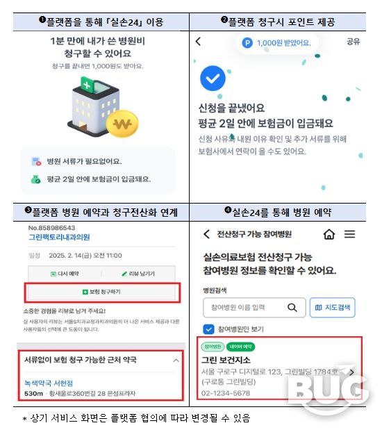 국민 대다수가 이용하는 온라인 플랫폼(네이버, 토스 등)을 이용하여 청구전산화 서비스를 쉽게 이용할 수 있게 하는 데도 노력을 기울일 계획이다. 전산개발을 거쳐 빠르면 ’25.11월부터 ➊플랫폼 앱을 통해 「실손24」 서비스를 동일하게 이용 가능하며, 실손24 앱 설치 없이도 가입 보험사 조회부터 보험금 청구까지 플랫폼 내에서 모든 과정을 진행할 수 있게 된다. ➋플랫폼을 통한 「실손24」 청구건에 대하여는 소비자에게 별도로 포인트 캐시백을 제공*할 예정이다. ➌또한, 향후 플랫폼이 제공하고 있는 고유 서비스(예: 병원 예약)와도 연계하여 병원 예약부터 보험금 청구까지 One-stop으로 진행할 수 있도록 서비스를 보다 편리하게 개선할 계획이다. ➍한편, 「실손24」를 통해서도 플랫폼(예: 네이버)의 병원 예약 서비스를 이용할 수 있는 상호간 서비스 연계는 이미 활용할 수 있다.