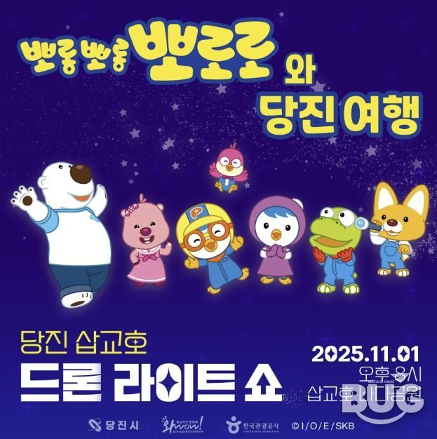 부울경문화뉴스 관리자 기자 | 당진시는 오는 11월 1일 삽교호관광지 바다공원 일원에서 ‘뽀롱뽀롱 뽀로로와 당진 여행’을 주제로 2025 당진 삽교호 드론 라이트 쇼의 화려한 폐막 공연을 개최한다고 27일 밝혔다.