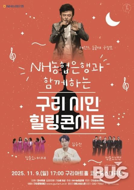부울경문화뉴스 관리자 기자 | 구리문화재단이 주관하고 NH농협은행 구리시지부가 주최하는 'NH농협은행과 함께하는 구리 시민 힐링 콘서트'가 오는 11월 9일 오후 5시, 구리아트홀 코스모스 대극장에서 열린다.