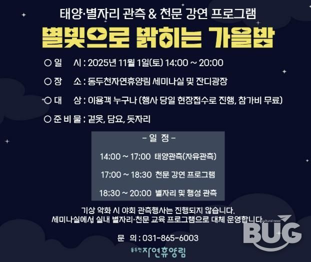 부울경문화뉴스 관리자 기자 | 동두천시시설관리공단은 오는 11월 1일 동두천자연휴양림에서 가을밤 하늘을 배경으로 별자리와 행성을 함께 관측하는 '천문행사 ‘별빛으로 밝히는 가을밤’'을 개최한다.