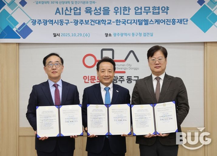 부울경문화뉴스 관리자 기자 | 광주 동구는 지난 29일 구청 접견실에서 광주보건대학교(총장 김경태), 한국디지털헬스케어진흥재단(원장 박기원)과 인공지능(AI) 헬스케어 산업 육성, 인구 감소 해결, 원도심 활성화를 위한 업무협약을 체결했다고 밝혔다.