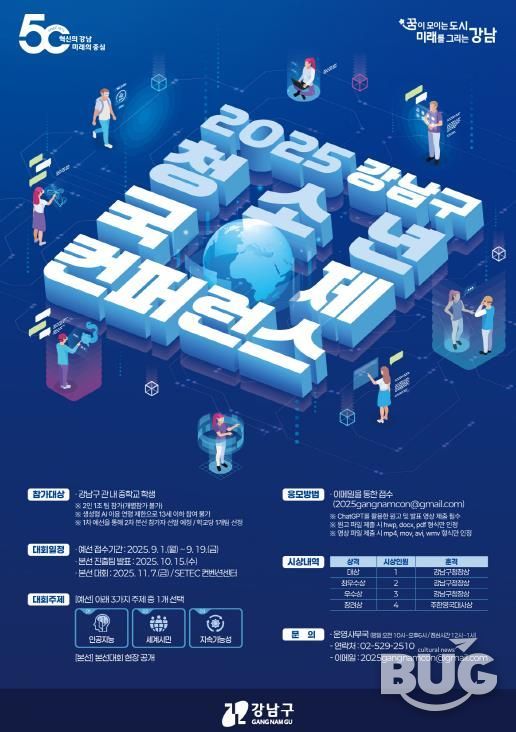 부울경문화뉴스 관리자 기자 | 꿈이 모이는 도시, 미래를 그리는 강남구가 11월 7일 오전 10시부터 오후 5시까지 SETEC 콘퍼런스센터(남부순환로 3104)에서 ‘2025 강남구 청소년 국제 콘퍼런스’를 개최한다. 이번 대회는 관내 중학생들을 대상으로 ‘생성형 AI(ChatGPT)를 활용한 국제 이슈 영어 발표’라는 새로운 형식의 창의 융합형 교육 축제로 마련됐다.