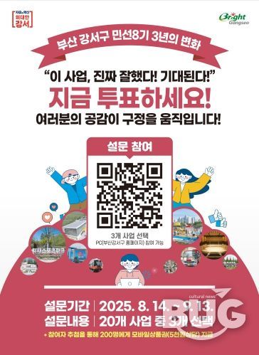 부울경문화뉴스 관리자 기자 | 부산 강서구는 민선8기 3년 동안 추진한 주요 사업 가운데 구민 체감도가 높은 사업 선정을 위해 8월 14일부터 9월 13일까지 설문조사를 진행한다.