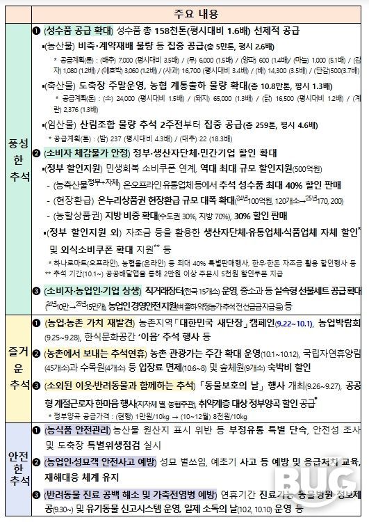 부울경문화뉴스 기자 | 농림축산식품부는 풍성한 추석, 즐거운 추석, 안전한 추석을 주요 골자로 하는 '농업·농촌분야 추석 민생안정대책'을 마련했다고 발표했다.