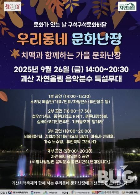부울경문화뉴스 관리자 기자 | 충북 괴산군은 ‘문화가 있는 날’ 주간을 맞아 오는 26일 오후 2시, 자연울림 음악분수 앞 특설무대에서 ‘문화가 있는 날 구석구석 문화배달 '우리동네 문화난장'’ 제7회차 행사를 개최한다고 밝혔다.