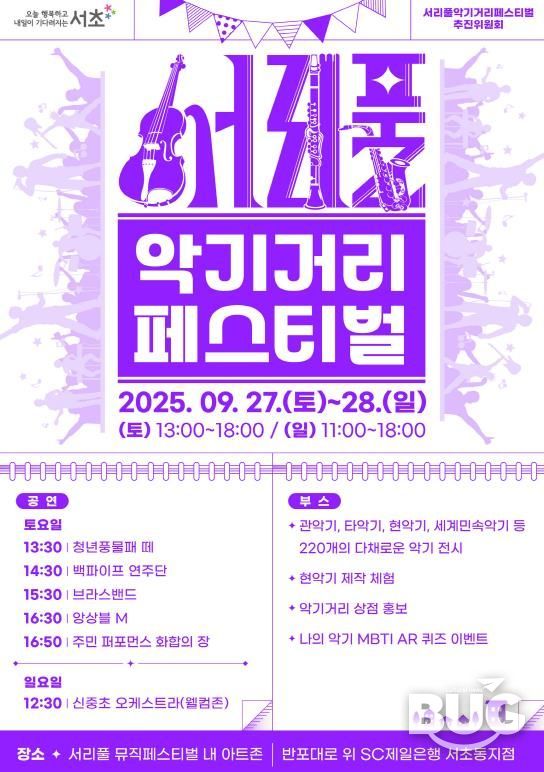 부울경문화뉴스 관리자 기자 | 서울 서초구는 '2025 서리풀뮤직페스티벌' 기간인 오는 27일부터 28일까지 반포대로 일대에서 ‘제7회 서리풀 악기거리 축제’를 개최한다고 밝혔다. ‘서리풀 악기거리 축제 추진단’이 주최·주관하는 이번 축제는 국내 유일 음악문화지구인 서리풀 악기거리에서 구의 악기거리 인프라를 활용해 모두가 함께 만들어 가는 문화축제다.