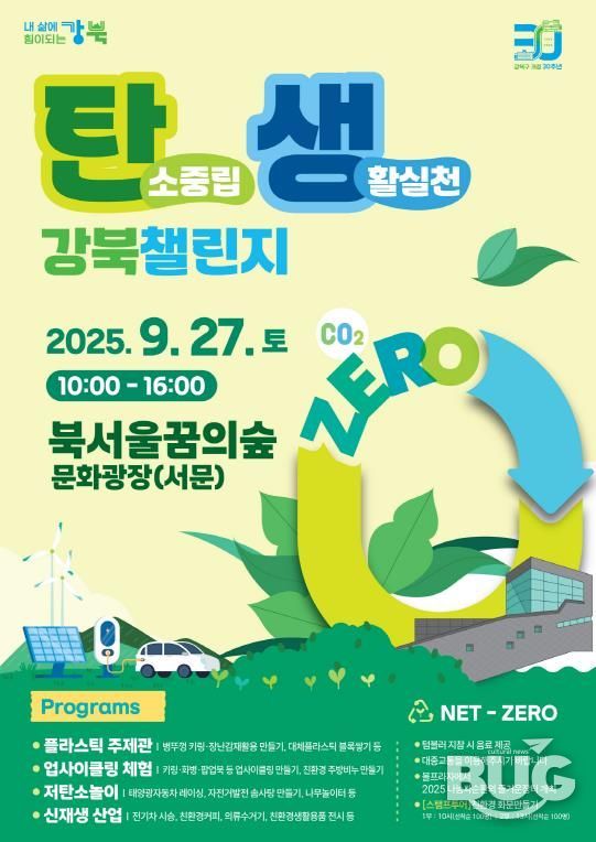 부울경문화뉴스 관리자 기자 | 서울 강북구는 오는 9월 27일 오전 10시부터 오후 4시까지 북서울꿈의숲 일대에서 ‘탄생 강북 챌린지(탄소중립 생활실천 강북 챌린지)’와 ‘2025 나눔과 순환의 즐거운 장터’를 개최한다.