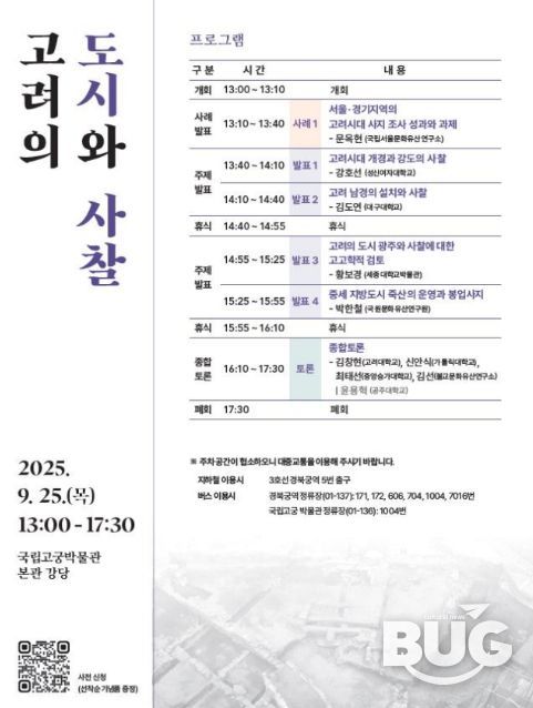 부울경문화뉴스 관리자 기자 | 국가유산청 국립문화유산연구원 국립서울문화유산연구소는 9월 25일 국립고궁박물관 본관 강당(서울 종로구)에서 ‘고려의 도시와 사찰’을 주제로 '제2차 중세문화포럼'을 개최한다.