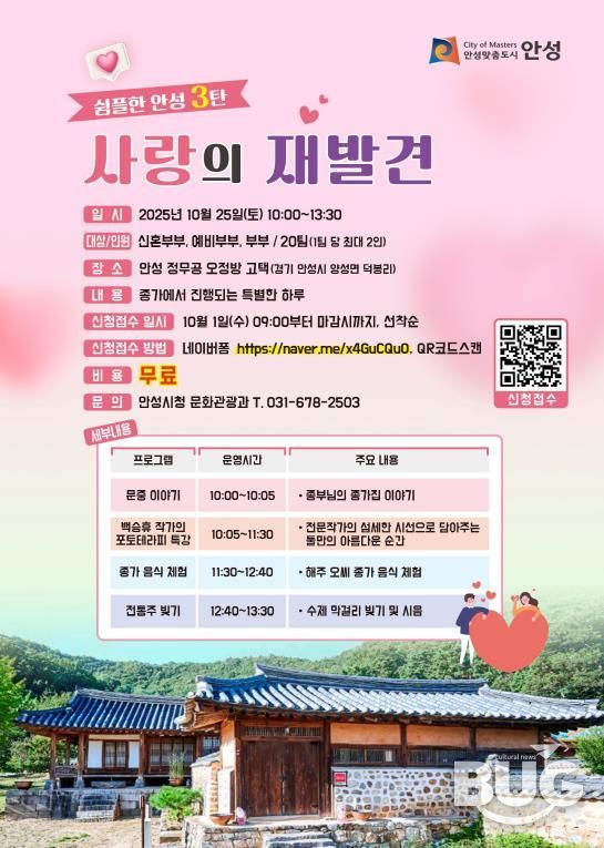 이번 프로그램은 신혼부부·예비부부·연인을 대상으로 하며, 고택에서 함께하는 하루를 통해 전통문화 속에서 서로의 소중함을 되새기는 시간을 마련했다. 참가비는 무료이며, 총 20팀(1팀 2인)이 참여할 수 있다. 신청은 10월 1일(수) 오전 9시부터 네이버폼을 통해 선착순으로 접수한다.