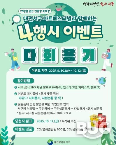 부울경문화뉴스 관리자 기자 | 대전 서구는 오는 10월 10일부터 12일까지 개최되는 ‘2025년 대전 서구 아트페스티벌’을 일회용품 없는 친환경 축제로 운영한다.