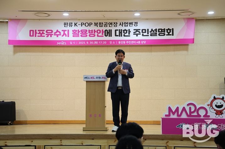 부울경문화뉴스 관리자 기자 | 서울시 마포구는 9월 30일 오후 용강동주민센터에서 마포유수지 한류 케이팝(K-POP) 복합공연장 조성사업 변경과 관련하여 주민설명회를 개최하고, 공연장 대신 주민 생활밀착형 체육문화복합시설을 새롭게 추진하겠다고 밝혔다.