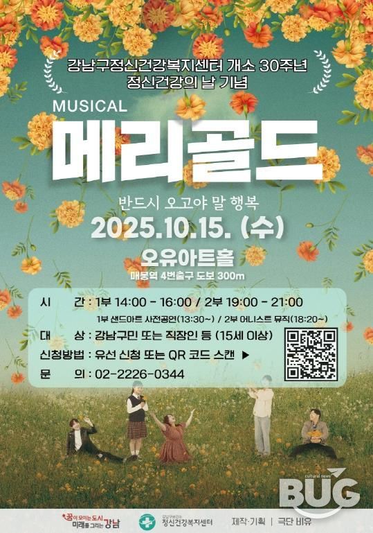 부울경문화뉴스 관리자 기자 | 꿈이 모이는 도시, 미래를 그리는 강남구가 정신건강복지센터 개소 30주년과 세계정신건강의 날(10월 10일)을 기념해, 오는 10월 15일 오후 2시와 7시, 오유아트홀(남부순환로378길 34-9)에서 구민과 함께하는 특별 뮤지컬 ‘메리골드 – 반드시 오고야 말 행복’을 개최한다.