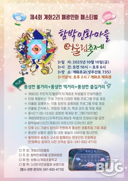 부울경문화뉴스 관리자 기자 | 보령시는 10일 오전 10시부터 오후 6시까지 개화초등학교에서 제4회 함박민화마을 어울림축제를 개최한다고 밝혔다.