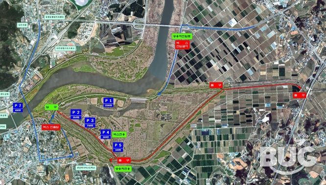축제장에서 나가는 길은 제 1주차장의 경우 입구 반대편 출구를 이용해 물넘이 구간 삼거리로 진입해 제방도로나 영산천 방향으로 빠져나가면 된다. 또 축제장이나 인근 임시주차장 이용 차량이 행사장에서 나올 때는 영산천이나 전남외국어고교 방향으로 빠져나가도록 했다.