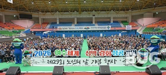 특히 2026여수세계섬박람회 성공개최를 응원하는 퍼포먼스가 진행돼 행사장에 모인 어르신과 내빈이 함께 섬박람회 성공을 기원하며 힘찬 구호를 외쳤다.
