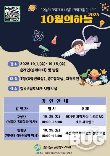 김재욱 칠곡군수는 “10월의 하늘 과학 강연이 청소년들에게 미래 과학자로 성장할 꿈의 씨앗이 되길 바라며, 도서관이 새로운 배움과 영감을 전하는 장으로 다양한 프로그램을 이어가겠다” 전했다.