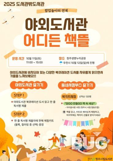 부울경문화뉴스 관리자 기자 | 청주시립도서관은 오는 11일 오전 11시부터 오후 3시까지 생명누리공원 일원에서 2025년 팝업놀이터와 연계해 ‘도서관밖도서관’을 운영한다.