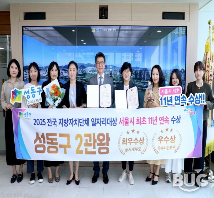 부울경문화뉴스 관리자 기자 | 서울 성동구가 ‘2025년 전국 지방자치단체 일자리대상’에서 공시제 부문 ‘최우수상’과 우수사업 부문 ‘우수상’을 수상하며 2관왕 달성과 동시에 2015년부터 11년 연속 수상이라는 대기록을 세웠다고 밝혔다.