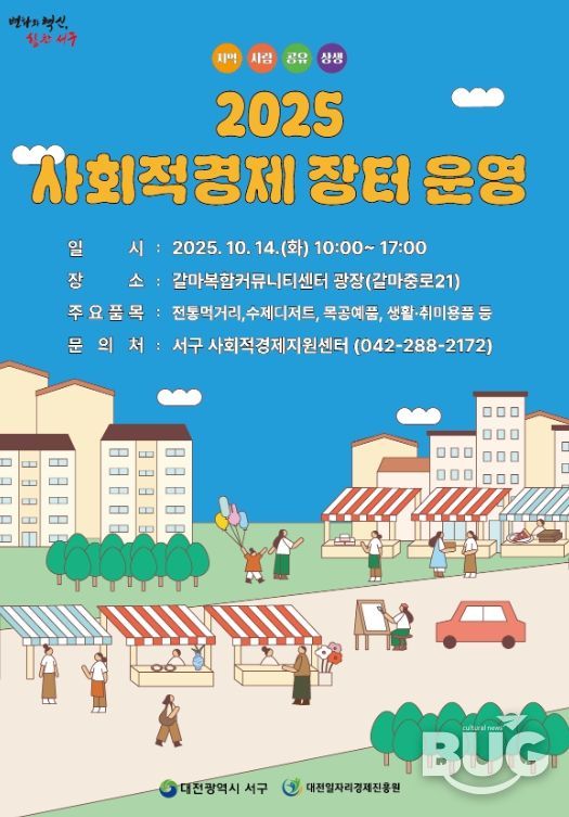 부울경문화뉴스 관리자 기자 | 대전 서구는 이달 14일 오전 10시부터 오후 5시까지 갈마복합커뮤니티센터 광장에서 지역·사람·공유·상생을 주제로 한 ‘2025 사회적경제장터’를 운영한다.