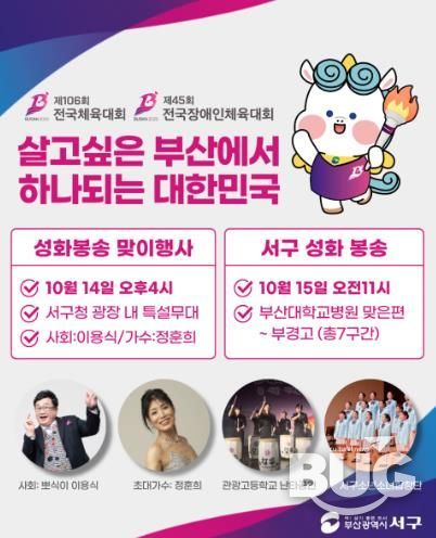 부울경문화뉴스 관리자 기자 | 부산 서구는 오는 10월 14일 16시, 제106회 전국체육대회와 제45회 전국장애인체육대회의 시작을 알리는 “성화의 불꽃, 하나되는 서구”를 주제로 성화봉송 맞이행사를 서구청 광장 특설무대에서 개최한다고 밝혔다.
