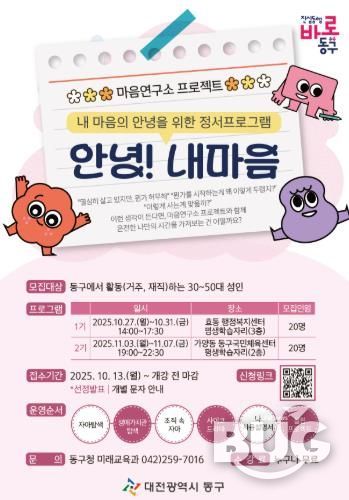 부울경문화뉴스 관리자 기자 | 대전 동구는 오는 13일부터 ‘내 마음의 안녕을 위한 정서프로그램’ 학습자를 모집한다고 10일 밝혔다.