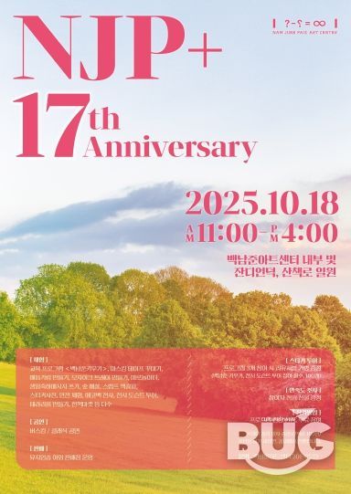 개관 17주년 기념 축제 ‘NJP+’는 NJP 즉, 백남준(Nam Jun Paik)아트센터와 지역, 공간, 문화, 관람객이 함께한다(+)는 ‘연계와 확장’의 의미를 담고 있다. 오전 11시부터 오후 4시까지 아트센터 뒤편 잔디 언덕을 중심으로 공연과 체험, 숲 해설 등이 어우러진 다양한 프로그램이 운영될 예정이다.
