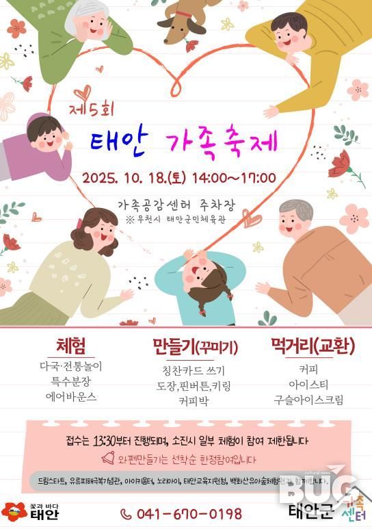 군 관계자는 “태안에 정착한 다양한 가족들의 삶을 함께 살피고 군민 모두가 밝게 웃는 태안을 조성하고자 이번 축제를 개최하게 됐다”며 “군민 누구나 즐길 수 있는 이번 축제에 많은 분들이 오셔서 가족과 함께 하는 가을의 행복을 만끽하시길 바란다”고 말했다.