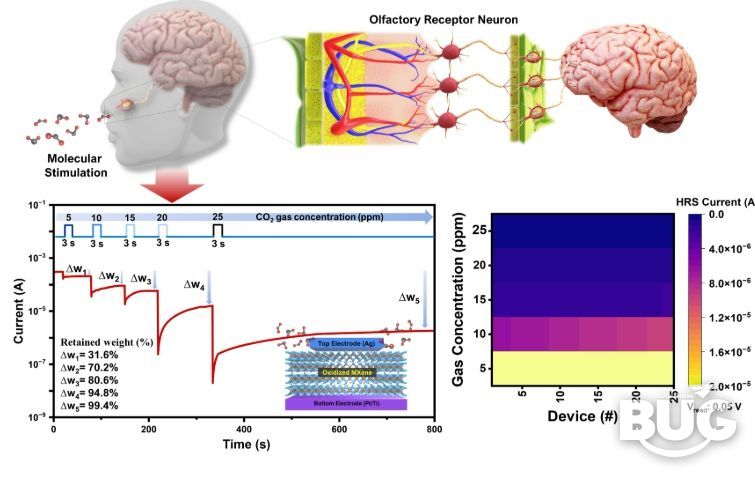 경상국립대학교 박준홍 교수 연구팀은 인간의 후각까지 모방하기 위해 반데르발스 소재인 산화 맥신(Mxene)을 활용하여, 분자의 흡착·탈착에 따른 소자 저항 특성의 준-가역적 제어와 분자 농도에 대해 다진법 연산이 가능한 ‘케미멤리스터’를 제시했다.