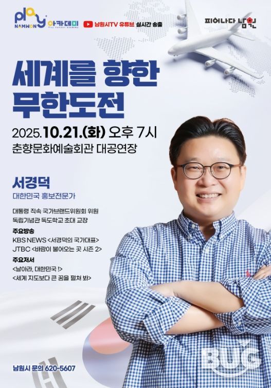 부울경문화뉴스 관리자 기자 | 남원시는 오는 21일 오후 7시, 춘향문화예술회관 대공연장에서 대한민국 홍보 전문가 서경덕 교수를 초청해 “세계를 향한 무한도전”이라는 주제로 플레이(Play) 남원 아카데미를 개최한다.