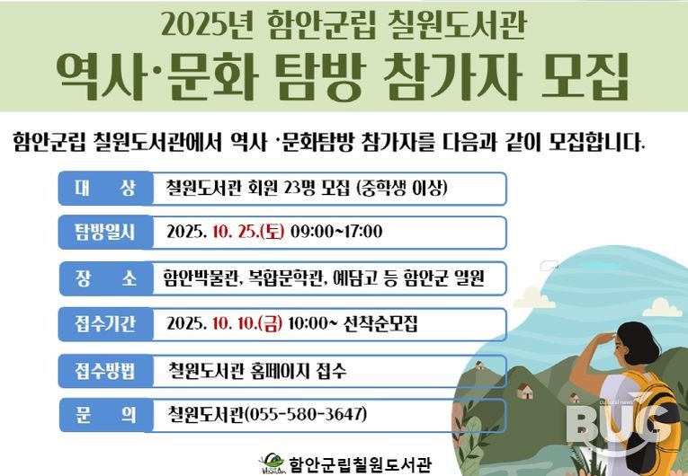 부울경문화뉴스 관리자 기자 | 함안군립 칠원도서관이 '2025년 하반기 역사·문화탐방' 프로그램 참가자를 모집한다.