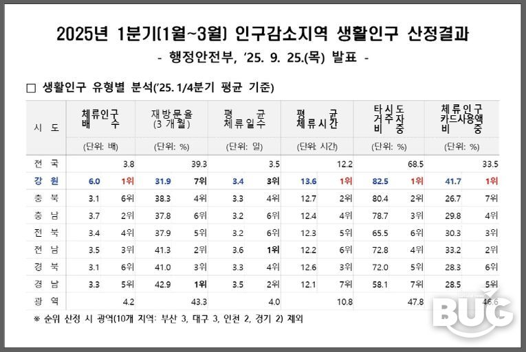 부울경문화뉴스 관리자 기자 | 강원특별자치도는 행정안전부가 9월 25일 발표한 ‘2025년 1분기 인구감소지역 생활인구 산정 결과’에서 체류인구 총 2,826,012명으로 전국 최고 수준을 기록했다고 밝혔다.