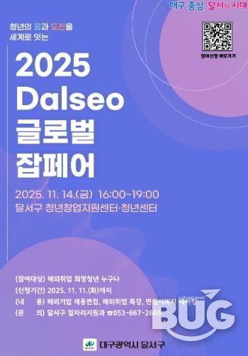 부울경문화뉴스 관리자 기자 | 대구 달서구는 오는 11월 14일, 달서구 청년창업지원센터·청년센터에서 해외취업을 희망하는 청년들을 대상으로 '2025 Dalseo 글로벌 잡페어'를 개최한다.