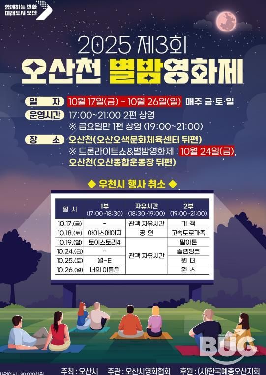부울경문화뉴스 관리자 기자 | 오산시는 오는 10월 17일부터 26일까지 매주 금·토·일 저녁, 오산천(오색문화체육센터 뒤편)에서 시민들이 야외에서 영화를 즐길 수 있는 '2025 제3회 오산천 별밤영화제'를 개최한다고 밝혔다.