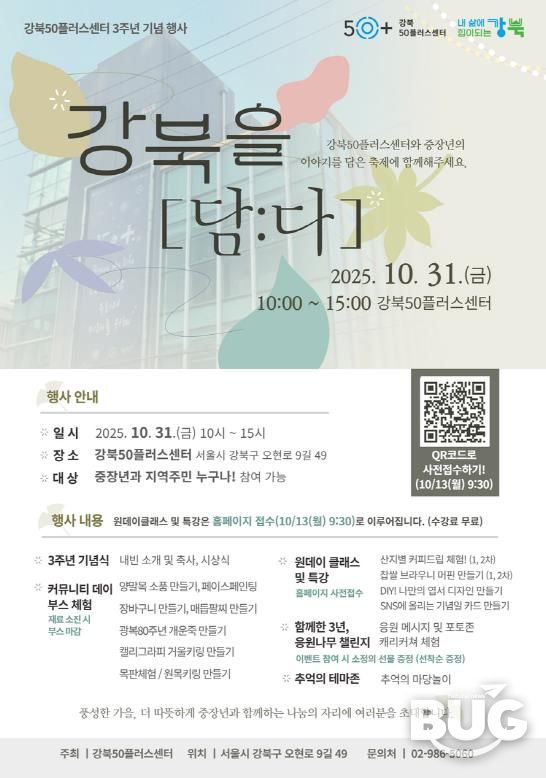 부울경문화뉴스 관리자 기자 | 서울 강북구는 오는 10월 31일 오전 10시부터 오후 3시까지 강북50플러스센터에서 개관 3주년을 기념하는 축제 ‘강북을 [담:다]’가 개최된다고 밝혔다.