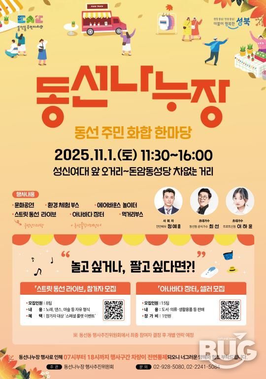 부울경문화뉴스 관리자 기자 | 서울 성북구는 오는 11월 1일 오전 11시 30분부터 오후 4시까지, 성신여대 앞 오거리에서 돈암동성당 구간까지 이어지는 거리에서 ‘2025년 차 없는 거리 동선나누장’ 행사를 개최한다고 밝혔다.