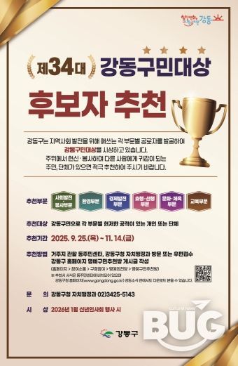 한편, 제34대 강동구민대상 시상식은 2026년 1월 열리는 신년인사회에서 진행될 예정으로, 최종 수상자에게는 구 각종 공식 행사에 우선 초청되는 특전과 함께 구정 참여 기회가 제공되며, 보다 자세한 사항은 강동구청 누리집(홈페이지) 또는 자치행정과를 통해 안내받을 수 있다.