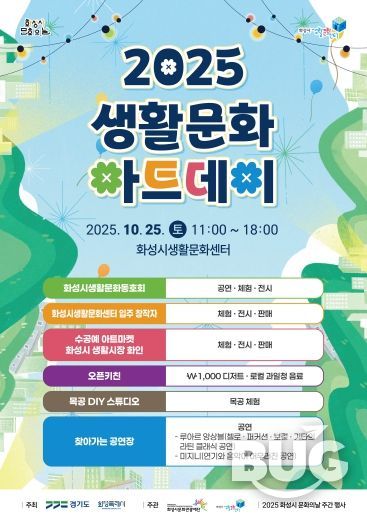 부울경문화뉴스 관리자 기자 | 화성시문화관광재단(대표이사 안필연)은 오는 10월 25일 토요일에 화성시생활문화센터에서 ‘2025 생활문화 아트데이’를 개최한다. 이번 행사는 ‘2025 화성시 문화의 날’ 주간을 맞아 시민들에게 생활문화를 체험하고 즐길 수 있는 기회를 제공하고, 지역 생활문화 활동가의 활동 기반을 마련하기 위해 기획됐다.