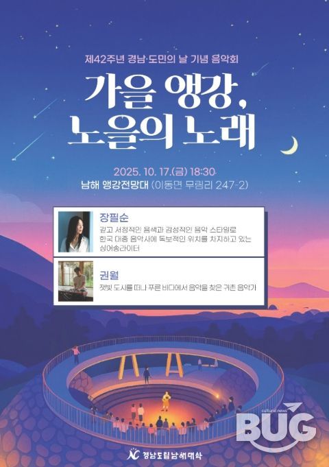 이번 공연은 별도의 신청 없이 누구나 무료로 관람 가능하며, 남해 앵강만의 노을 풍경 속에서 음악으로 물드는 특별한 가을밤이 될 것으로 기대된다.